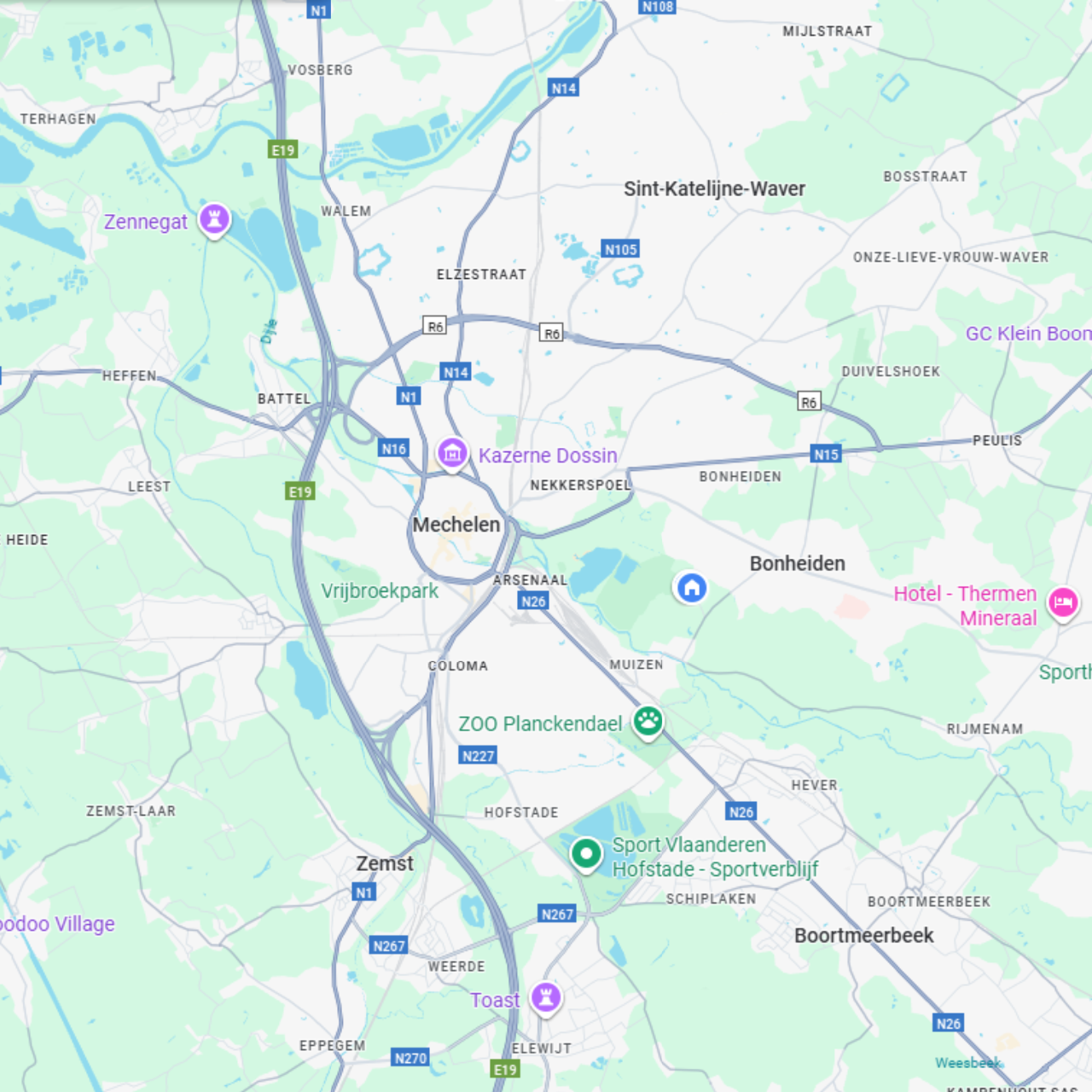 Mechelen, Muizen, Hombeek, Battel, Heffen, Leest, Walem, Bonheiden, Rijmenam, Sint Katelijne Waver, Onze Lieve Vrouw Waver, Hever, Boortmeerbeek, Hofstade, Elewijt, Schiplaken, Eppegem, Zemst, Weerde